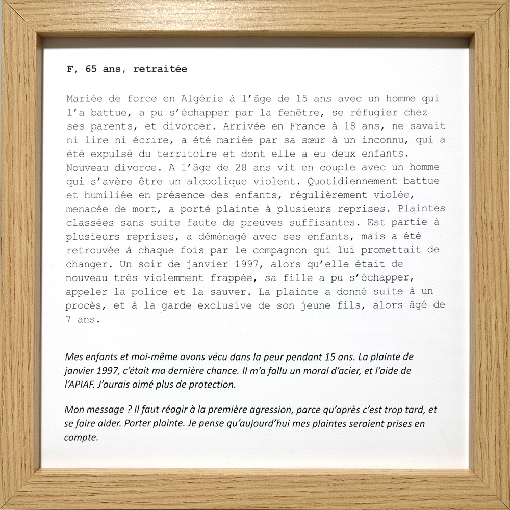 Au cours de longs entretiens, dix femmes et dix hommes, de 20 à 71 ans, victimes de violences extra ou intrafamiliales, se sont livrés à Danièle Boucon. Confrontés à des agressions sexuelles, à des sévices corporels ou à des maltraitances psychiques, ces femmes et ces hommes portent en eux le traumatisme qui a marqué leurs vies. Chaque rencontre fut une expérience intense. Après un silence lourd, des hésitations, la première parole a ouvert la voie, les mots se sont révélés, les maux se sont enchaînés. L’artiste est entrée en résonance avec les paroles prononcées, sur le fil de l’émotion palpable. Doucement, la confiance s’est installée. C’est dit. Alors le silence peut revenir, apaisé.